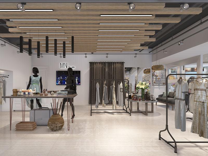 本案例为女装店装修案例,本案例店铺因地制宜采用了开放式设计,技能合理利用空间又能给顾客以全方位展示,一举两得,在一侧的入口处设置以个性的橱窗,内部并没有选择花哨的颜色,个性的衣架分布于浏览区,顶部设置以个性的造型配合以个性射灯,整个空间清新、典雅、庄重。
